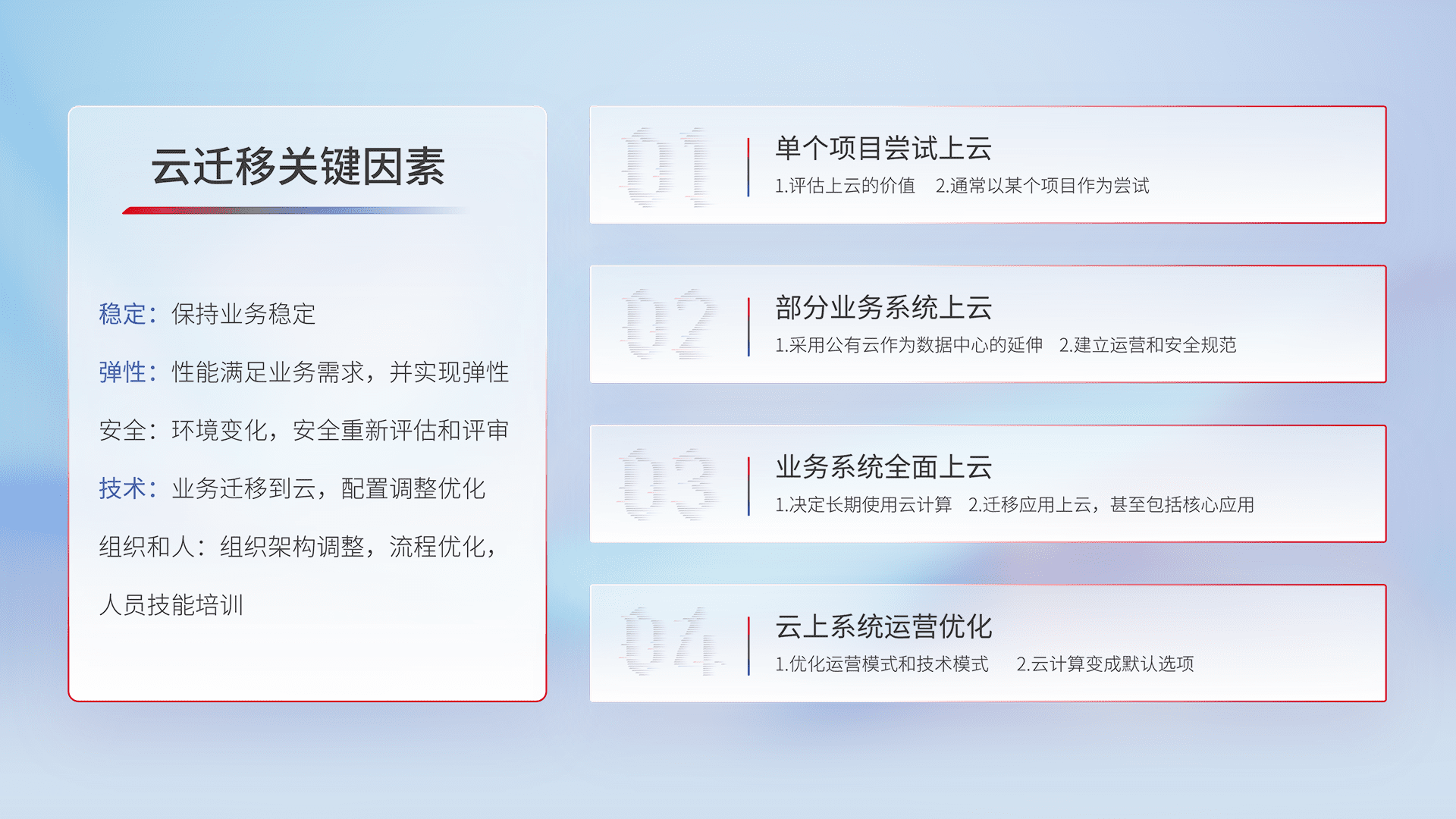 结合实际业务,,,,从规划设计、、、云平台选型、、、、云原生改造、、、、数据迁移、、、集成交付,,,迁移全过程为客户识别最佳上云路径,,,做好风险识别管理,,,设计网络架构、、、、身份权限、、、安全审计合规、、、、操作审计、、日志审计、、、、监控告警策略、、、、多站点容灾设计等,,对云上基础设施进行整体规划,,,,提升IT治理水平,,,以满足弹性、、、、高可用、、、、高性能的需求。。。