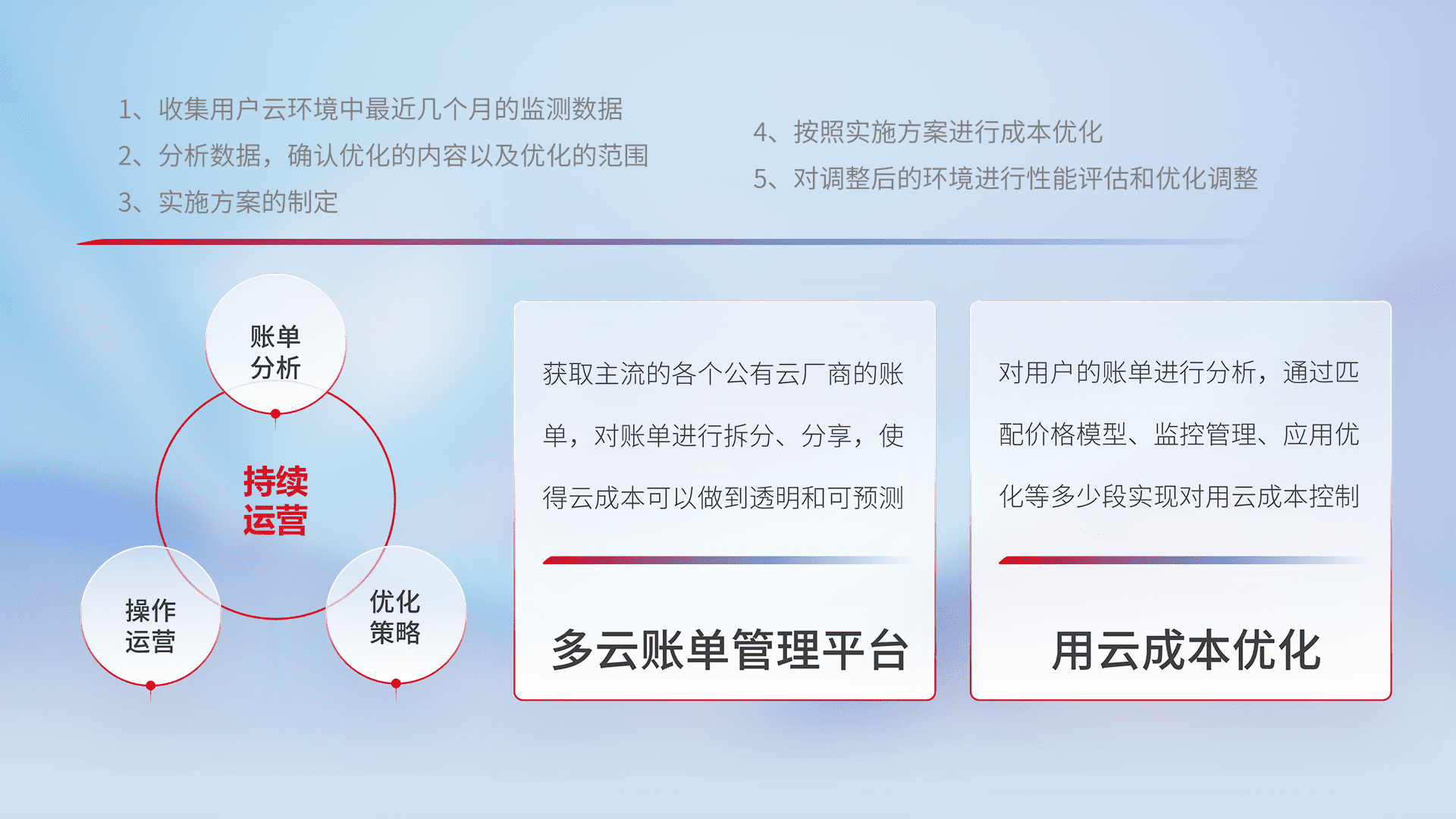 通过多云纳管,,,以统一的资源数据模型把客户的云资源进行抽象和封装,,,,进而实现对多云资源的统一操作,,,,保障云资源管理的可靠性、、、、稳定性与可用性。。。。量身定制化运维内容,,配置、、、开发运维、、、、补丁管理、、、、备份、、、、监控、、、认证和访问管理、、、、审计和日常巡检等,,保障在用云过程中的可靠度,,稳定度以及高可用率。。